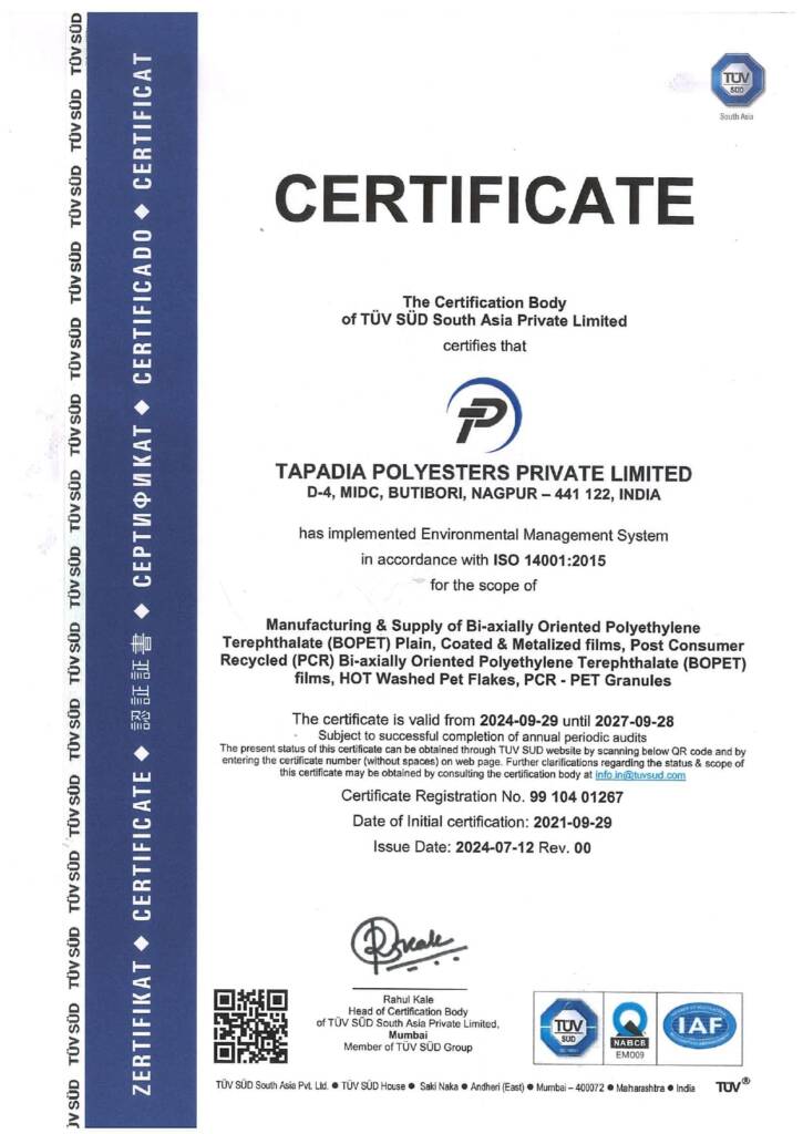At Tapadia Polyesters, we manufacture premium PET films and lead in PET recycling. Recognizing the impact of multi-layer packaging, we endeavoured to using post-consumer waste in our films. To ensure good quality recyclates, we established our own PET Bottle Washing Plant. With waste aggregator partnerships and advanced European sorting technology, we deliver top-grade rPET. Today, we supply bottle-to-bottle chips manufacturers worldwide, high end sheet manufacturers in Europe and to manufacturers of environmentally sensitive rPET Films.